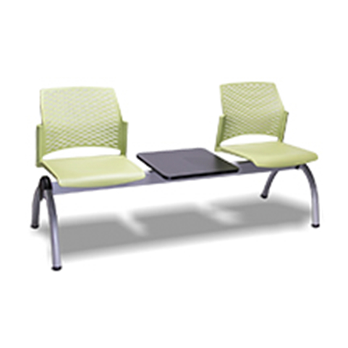 BANCA REWIND DE 2 PLAZAS CON MESA, ACABADO EN POLIPROPILENO CON RESPALDO RETICULADO, ESTRUCTURA EN ACERO TUBULAR REDONDO CROMADA.