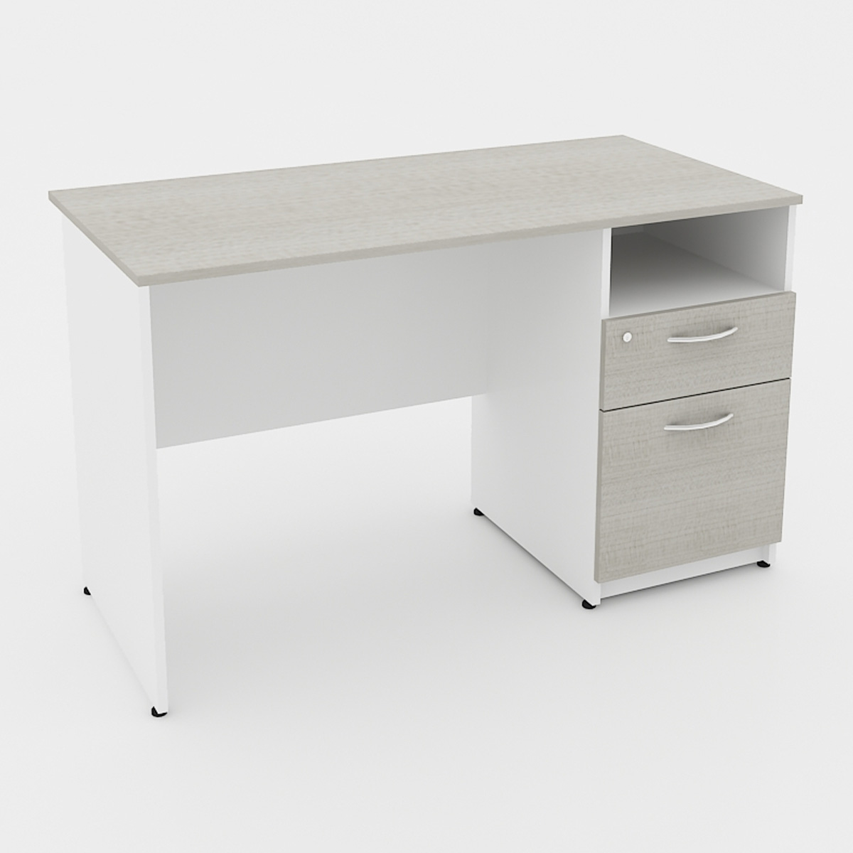 ESCRITORIO CON CUBIERTA DE MELAMINA CON 1 PEDESTAL: 2 CAJONES Y 1 PORTA PAPELERO. FRENTE: 120 cm FONDO: 60 cm ALTO: 75 cm. CALIBRE 16 mm.