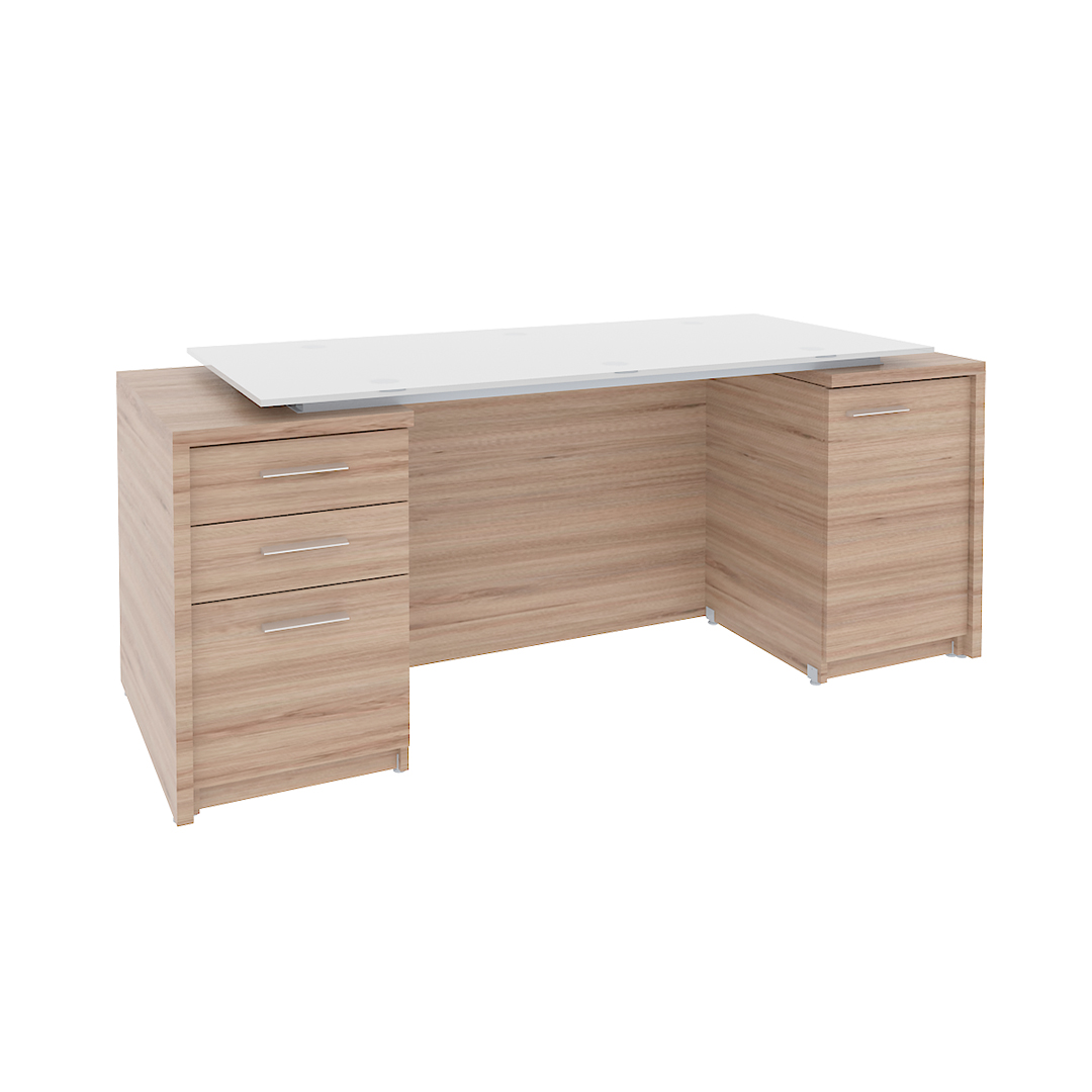ESCRITORIO DIRECTIVO CON CUBIERTA DE CRISTAL TEMPLADO CON CUERPO DE MELAMINA, CUENTA CON 2 PEDESTALES UNO DE 3 CAJONES Y OTRO CON PUERTA: FRENTE: 180, FONDO:70, ALTO: 75 cm, CALIBRE DE .28/32mm.