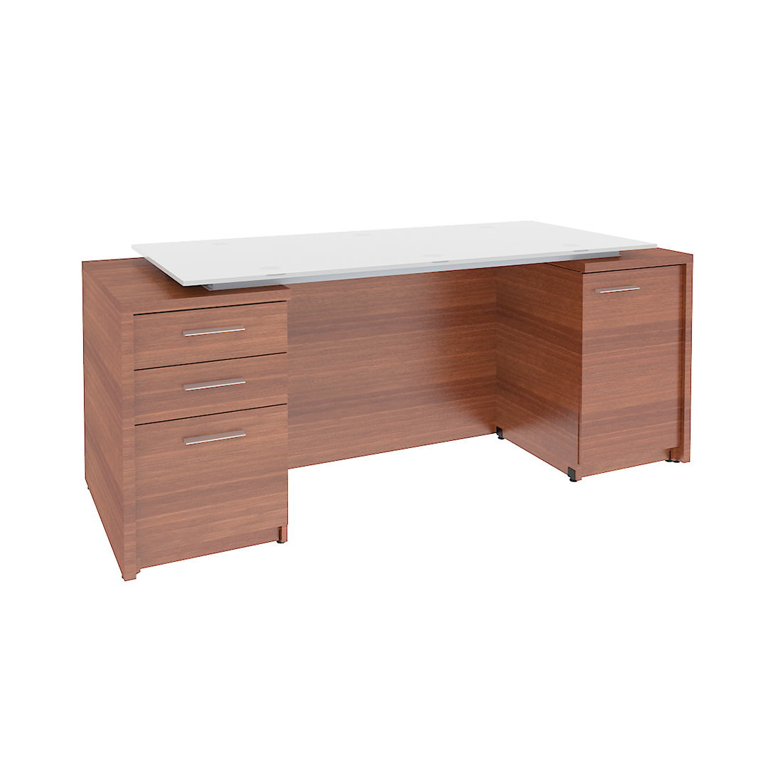 ESCRITORIO DIRECTIVO CON CUBIERTA DE CRISTAL TEMPLADO CON CUERPO DE MELAMINA, CUENTA CON 2 PEDESTALES UNO DE 3 CAJONES Y OTRO CON PUERTA: FRENTE: 210, FONDO:70, ALTO: 75 cm, CALIBRE DE .28/32mm.