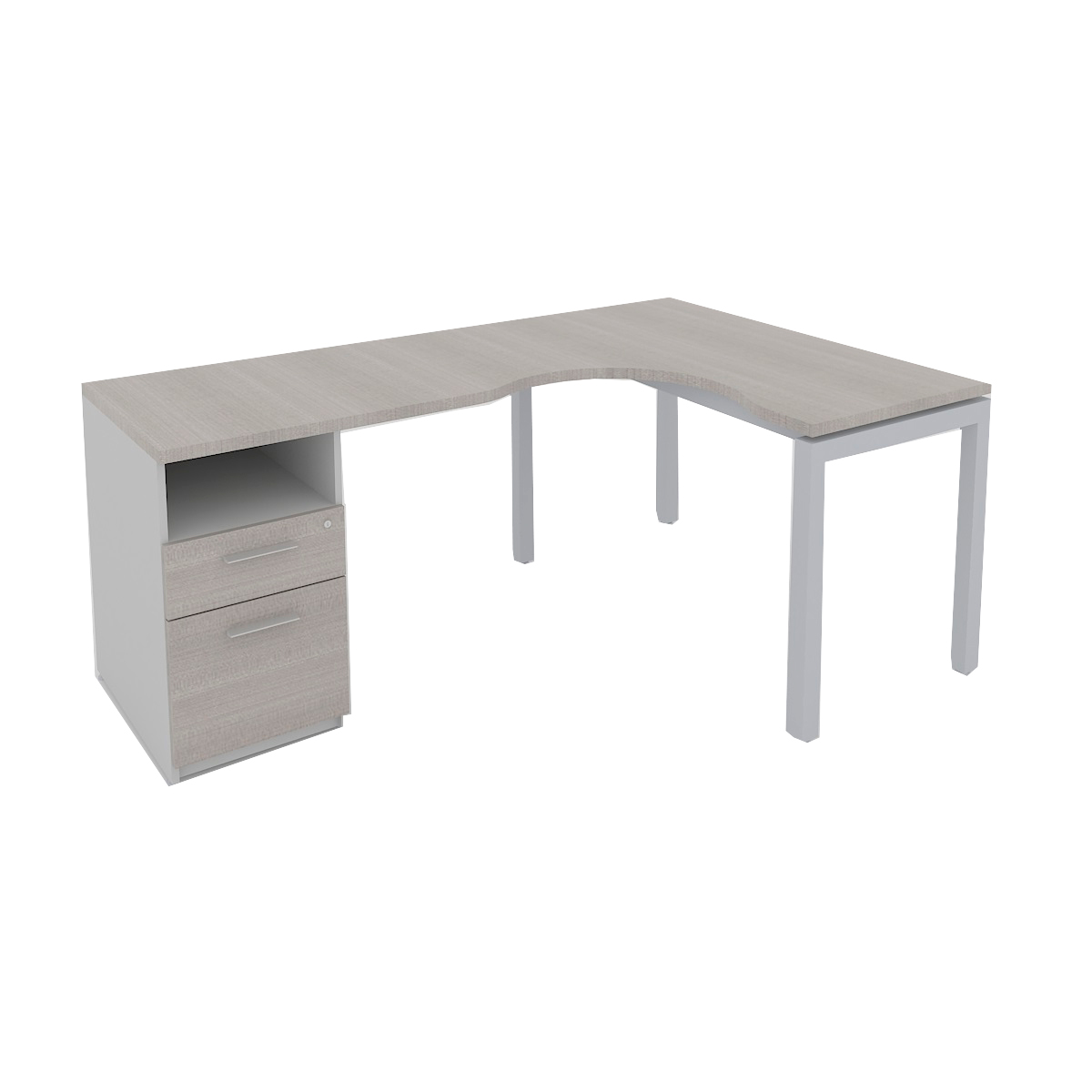 ESCRITORIO “J” CUBIERTA CALIBRE 28 MM, CON PEDESTAL, PATA METÁLICA TIPO U, FRENTE: 180, FONDO: 120, ALTO: 75 (IZQUIERDO)