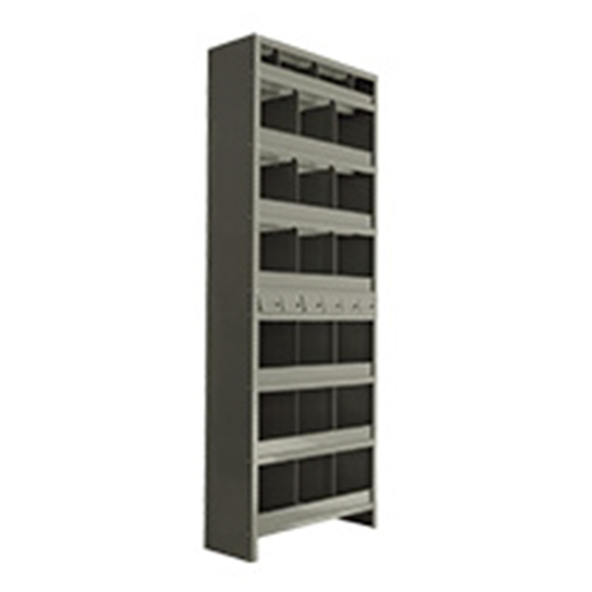 ESTANTE COMBINADO CON 6 CAJONES Y 13 DIVISIONES ALTAS Y 9 BAJAS. FRENTE: 92 CM FONDO: 30 CM ALTO: 221 CM. COLOR: ARENA O NEGRO GOFRADO TEXTURIZADO