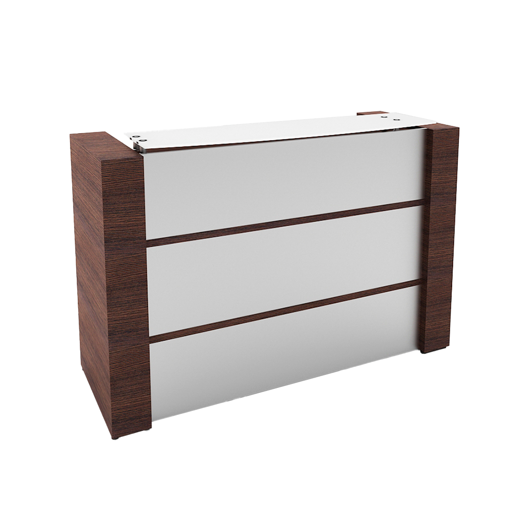 MOSTRADOR RECTO TAMBOR 3 FRENTES MELAMINA CUBIERTA DE CRISTAL TEMPLADO; FRENTE: 150, FONDO: 60 cm , ALTO: 110 cm