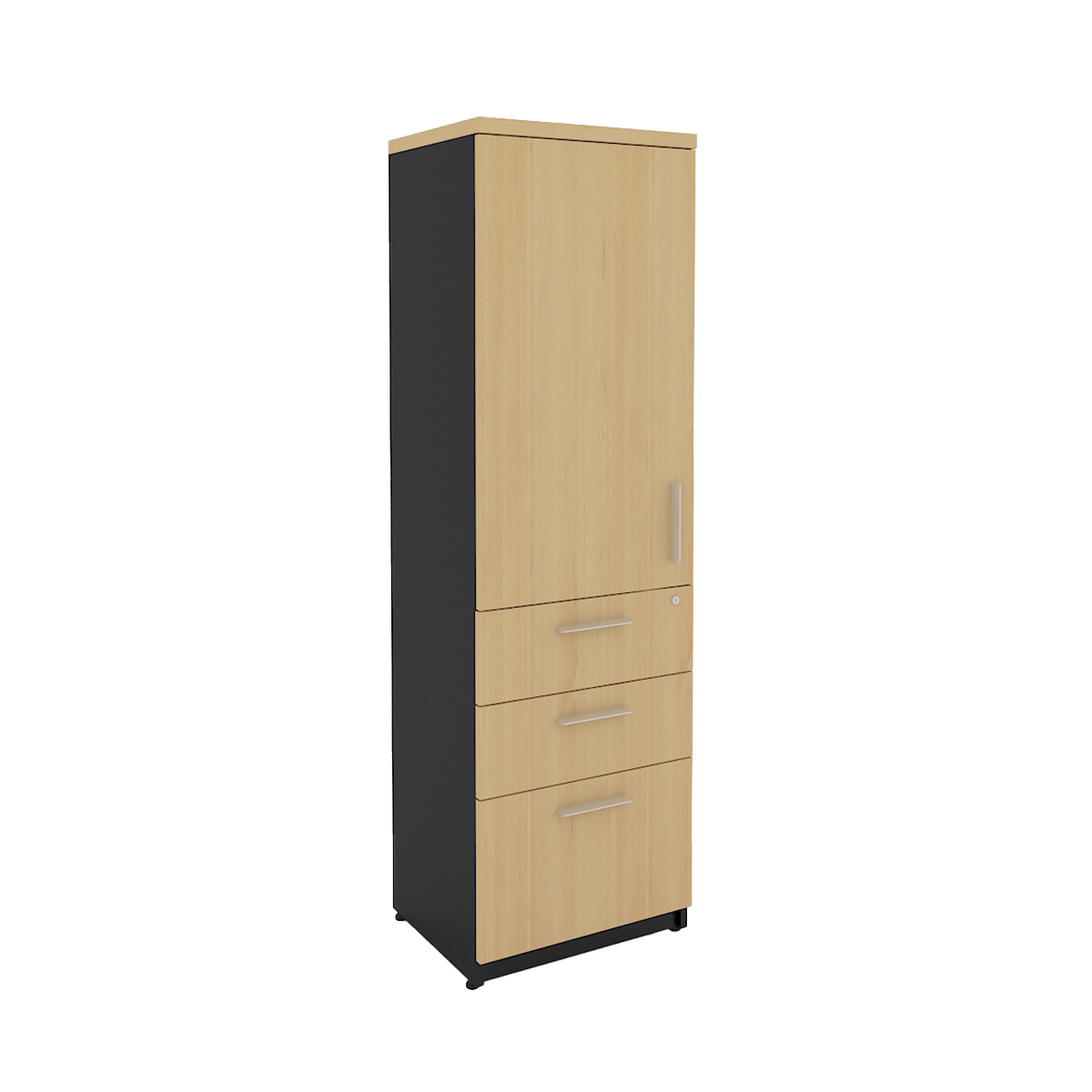 PEDESTAL ALTO DE MELAMINA CON 3 CAJONES Y ENTREPAÑOS CON PUERTA IZQUIERDA. FRENTE: 50 CM FONDO: 40 CM ALTO: 160 CM