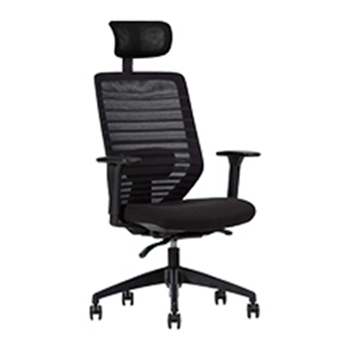 SILLA EJECUTIVA CON RESPALDO ALTO CON CABECERA AJUSTABLE , MECANISMO SYNCHRO MULTIPOSICIONES, BRAZOS AJUSTABLES DE ALTURA, BASE NYLON Y ESTRUCTURA NEGRA, SOPORTE LUMBAR, RESPALDO EN MALLA Y ASIENTO TAPIZADO COLOR NEGRO.