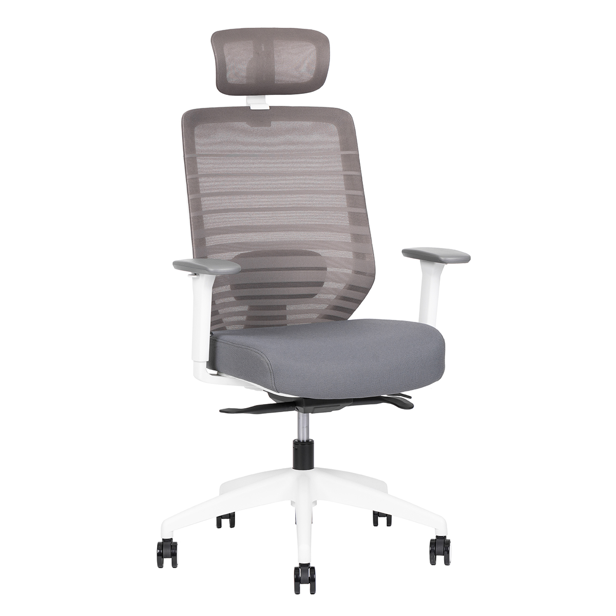 SILLA EJECUTIVA CON RESPALDO ALTO CON CABECERA AJUSTABLE , MECANISMO SYNCHRO MULTIPOSICIONES, BRAZOS AJUSTABLES DE ALTURA, BASE NYLON Y ESTRUCTURA GRIS CLARO, SOPORTE LUMBAR, RESPALDO EN MALLA Y ASIENTO TAPIZADO. COLOR GRIS.