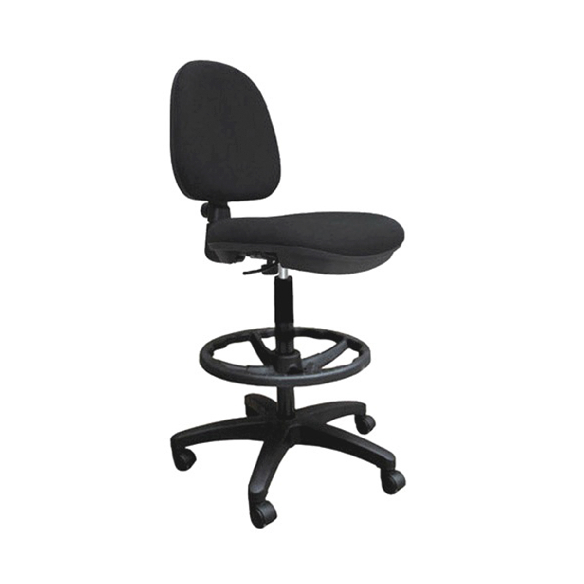 SILLA SECRETARIAL ELEVACIÓN NEUMÁTICA CON KIT EXTENSIÓN TIPO CAJERO, SIN BRAZOS, RESPALDO EN PROLIPROPILENO, ACOJINAMIENTO EN ASIENTO Y RESPALDO EN POLIPROPILENO REFORZADO FLEXIBLE DE ALTA DENSIDAD, TAPIZADA EN TELA NEGRA.